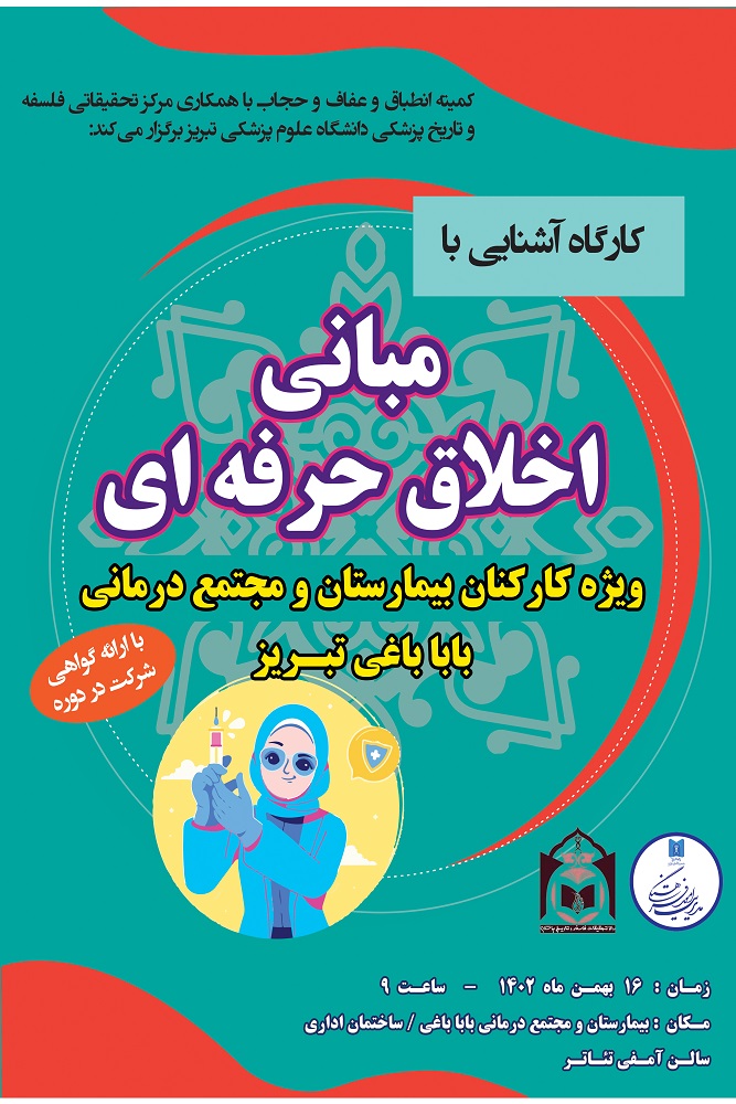 دبیرخانه کمیته انطباق و عفاف و حجاب دانشگاه علوم پزشکی تبریز کارگاه انطباق (آشنایی با مبانی اخلاق حرفه ای با محوریت رعایت حریم بیمار) ویژه کارکنان و دانشجویان و دستیاران بیمارستان و مجتمع درمانی باباباغی تبریز را در روز دوشنبه ۱۶ بهمن ساعت ۹ در محل بیمارستان و مجتمع درمانی باباباغی تبریز، ساختمان اداری، سالن آمفی تئاتر برگزار می کند.